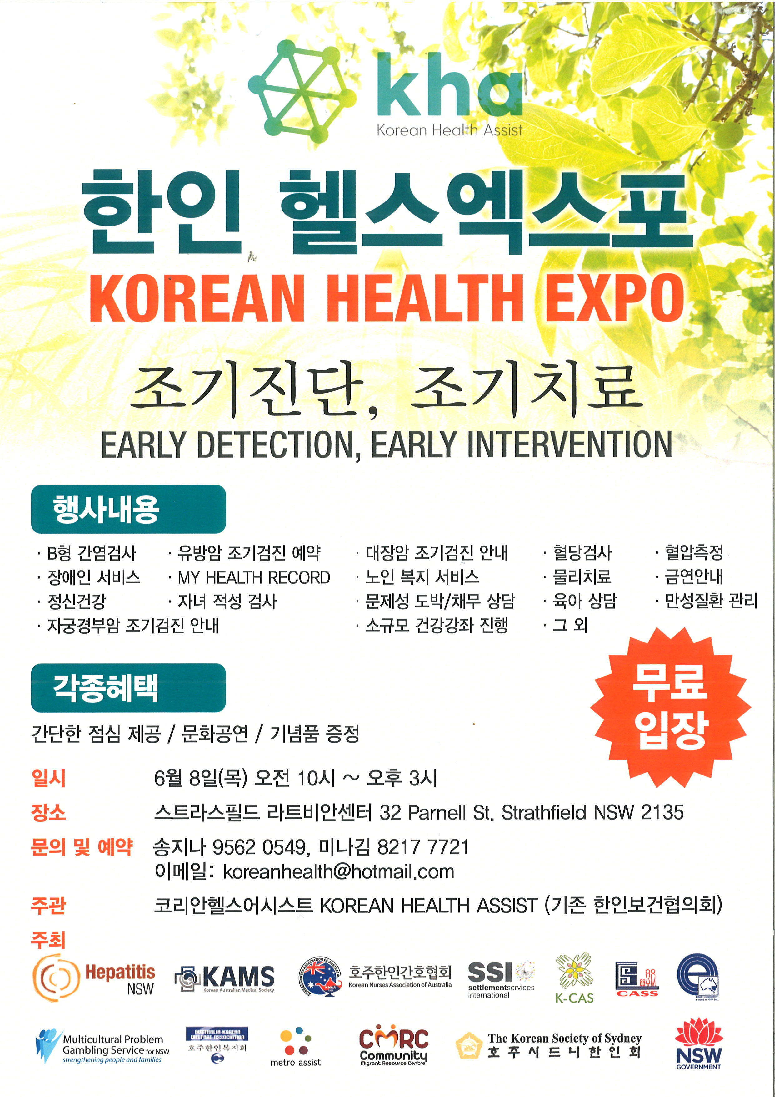교통 좋은 스트라스 필드에서한인들을 위한 헬스 엑스포가 오는 6월 8일 스트라스필드에서 열립니다. B형 간염검사, 유방암, 대장암, 자경경부암 조기검진 안내 및 노인복지서비스 안내 등 어르신들이 필요한 건강 및 생활 관련 정보를 한 곳에서 받을 수 있습니다.